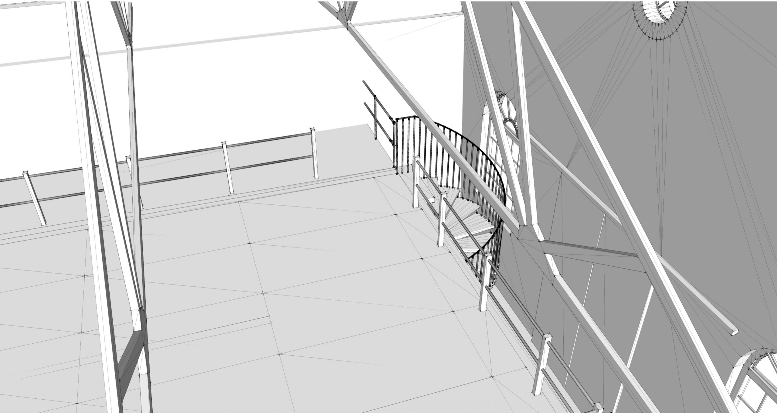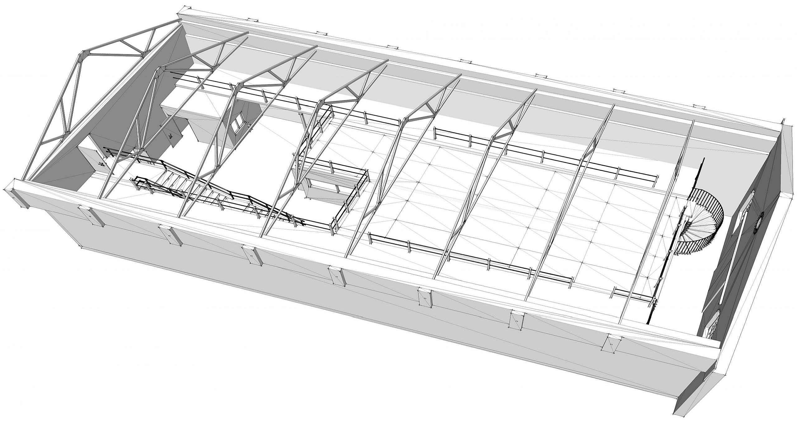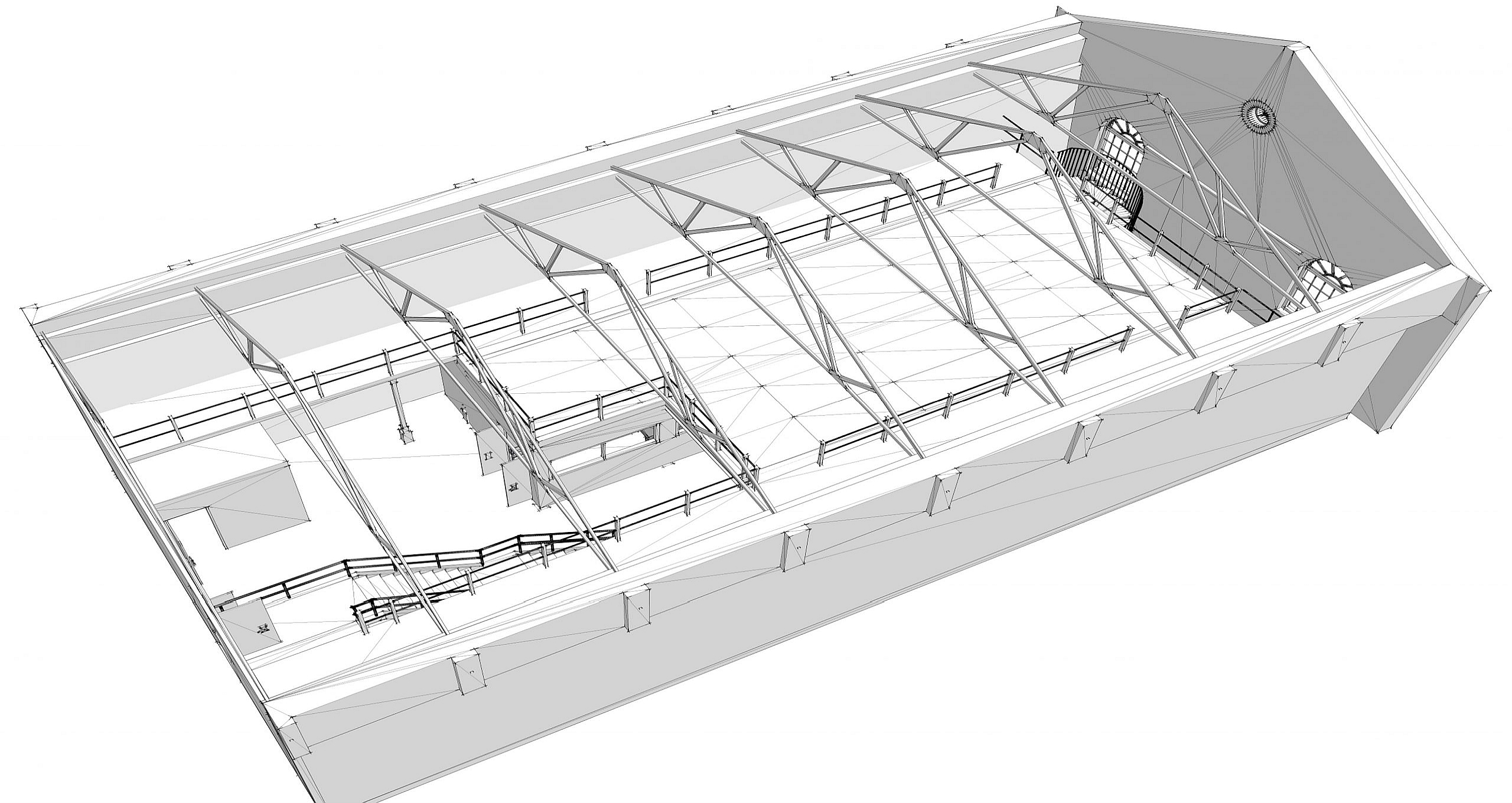 The survey involved using a cherry picker to inspect and document roof structures, trusses, door mechanisms, and walls.