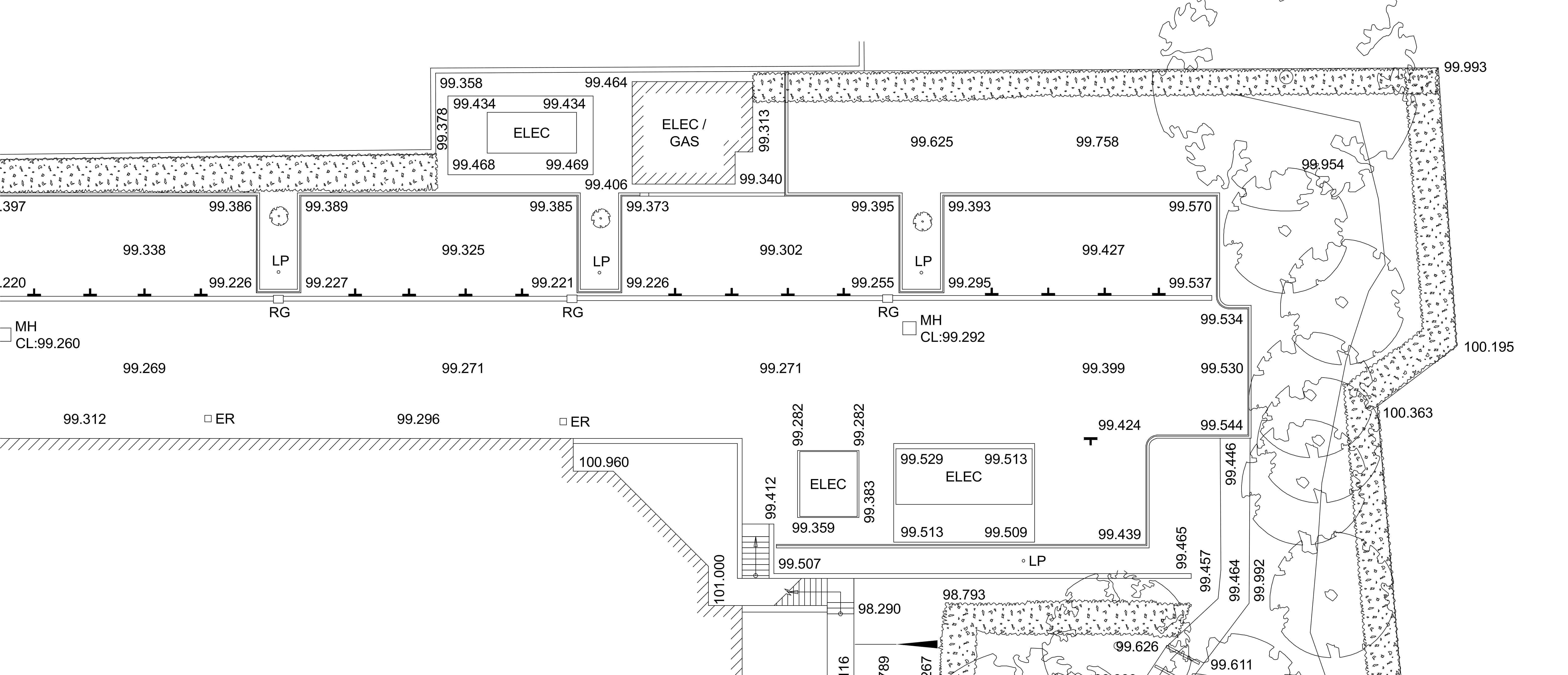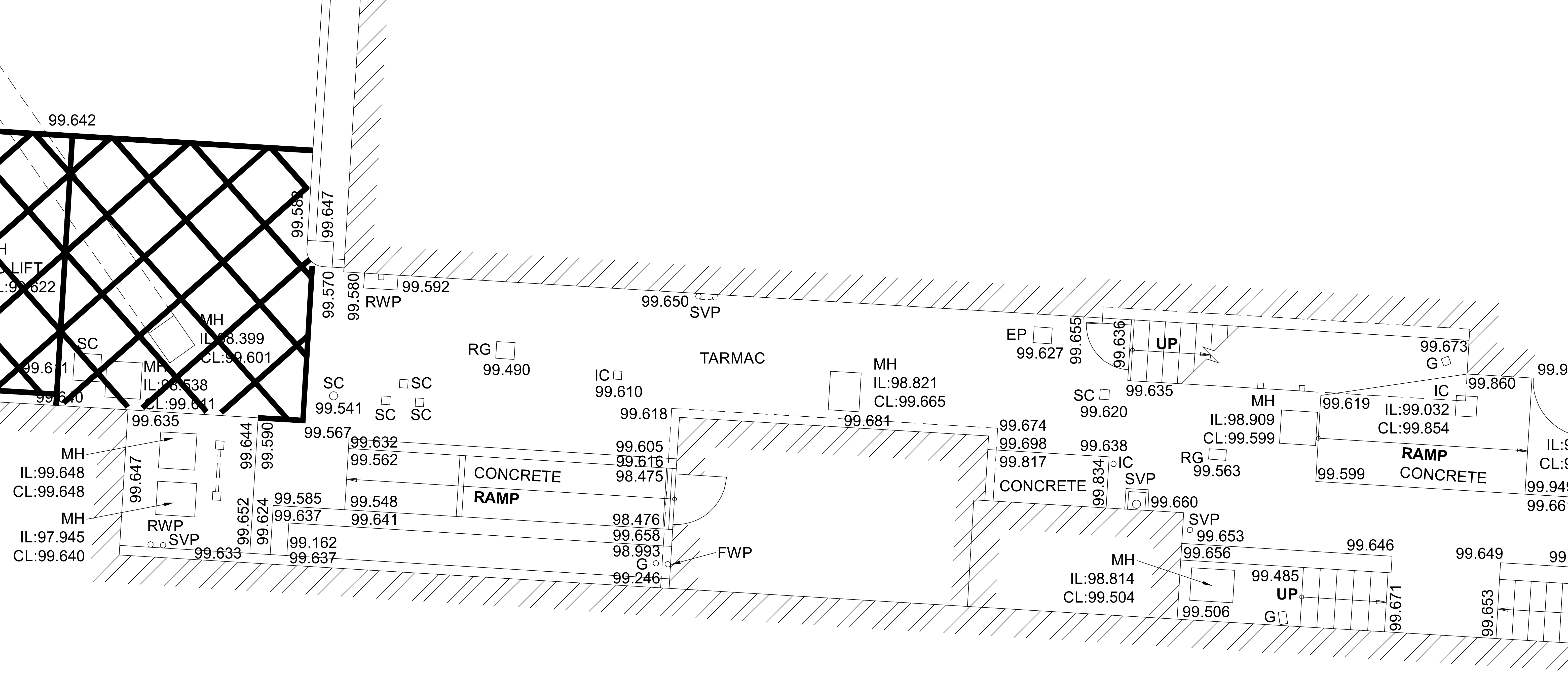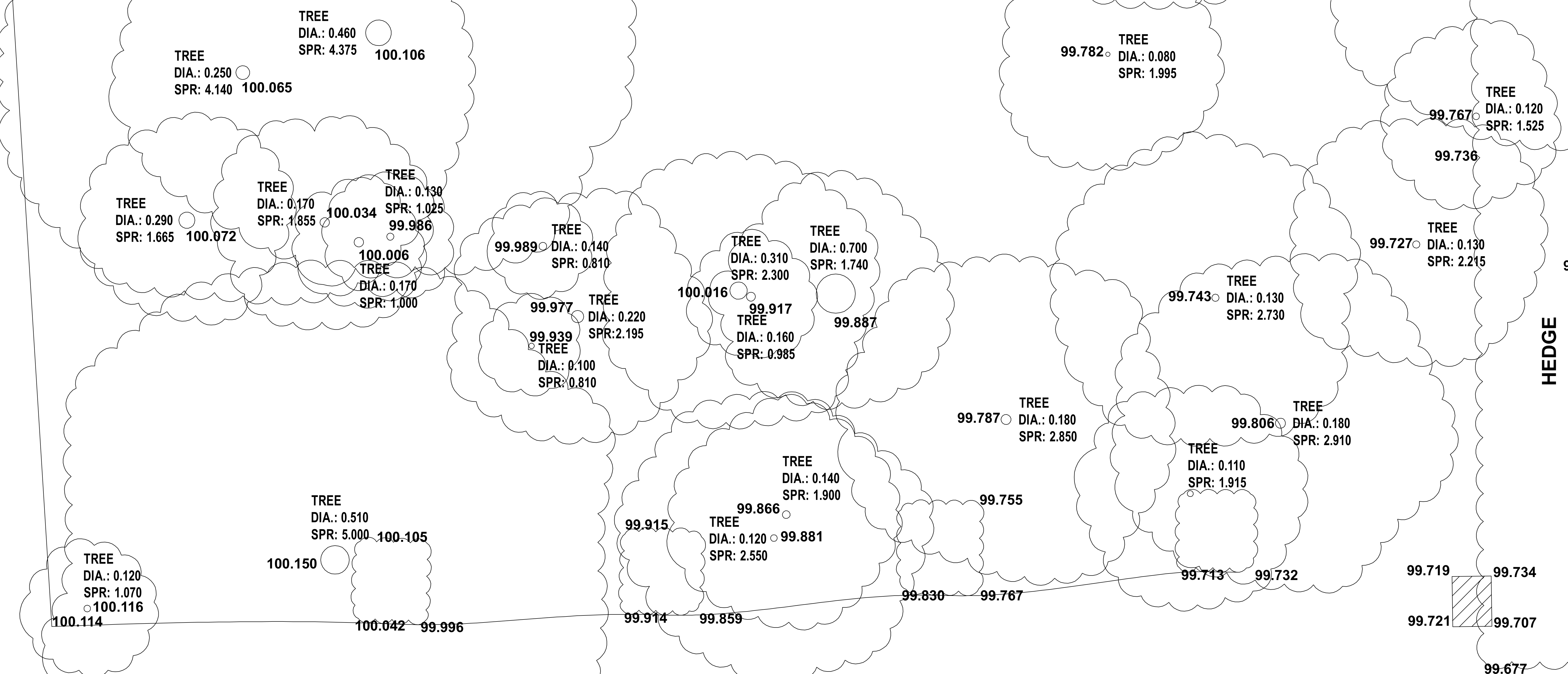 In addition, cover and invert levels of manholes were taken, the size and fall of drainage runs and any airborne services within the area were picked up (typically power and communication lines). Generic trees and bushes were recorded to reflect their trunk size / spread and extent.